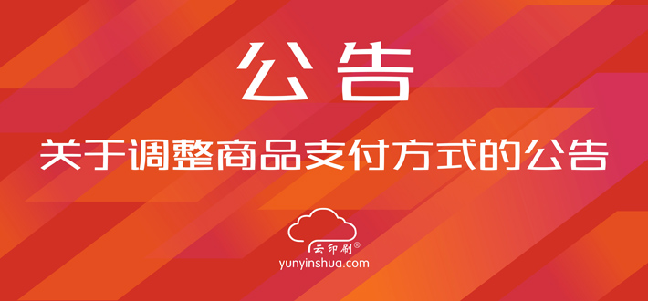 ? ? ? ?您好!為了給您提供更加便捷高效的商品結(jié)算服務(wù)及避免現(xiàn)金結(jié)算帶來的麻煩,我們將于近期對云印刷網(wǎng)商品支付方式進(jìn)行調(diào)整,具體調(diào)整方案如下: